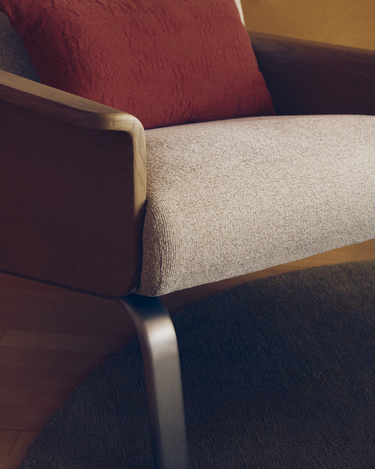 With an elegant and timeless design, this collection becomes the protagonist of any space. Its small-structured chenille upholstery not only provides a warm and sophisticated texture but is also made with 100% recycled polyester with a water-repellent treatment. This material is sourced from a Global Recycled Standard certified supplier, which ensures a lower use of resources and virgin material. It is also OEKO-TEX® STANDARD 100 certified, which ensures environmentally safe and responsible production. The structure of this armchair combines the resistance of 18mm plywood covered with oak veneer with the visual appeal of its clean-lined armrests. The legs, made of 1.8mm diameter brushed stainless steel tube, reinforce its design with a contemporary and stable touch. It offers an ideal medium seat firmness for everyday use, thanks to a curated combination of webbing, springs and high-density foam layers (35kg/m³ and 40kg/m³), which provide firmness, durability and excellent comfort.