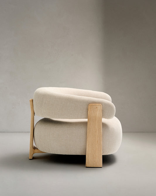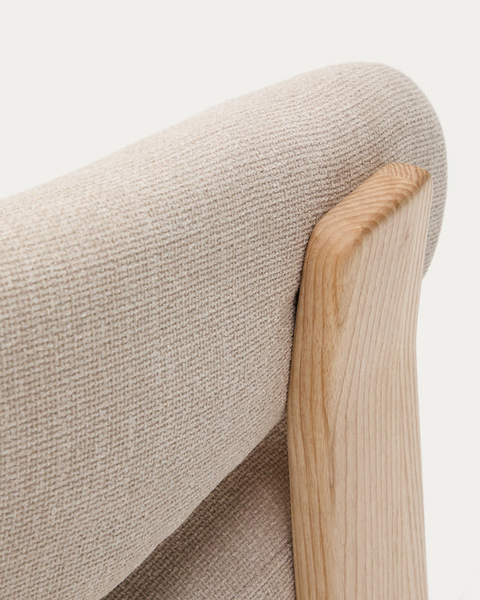 - Armchair upholstered in thick, two-tone beige-coloured chenille with recycled polyester and solid ash wood legs in a walnut finish.