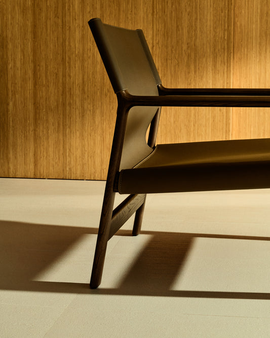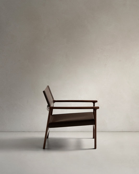 Jan armchair made of dark brown recycled leather fibres and FSC 100% solid ash wood with walnut-coloured finish
