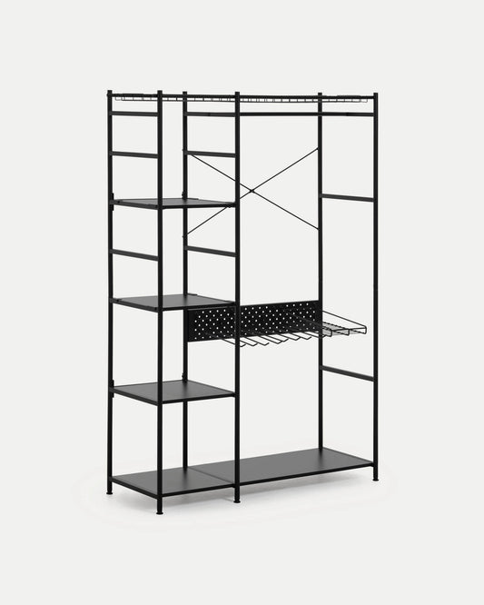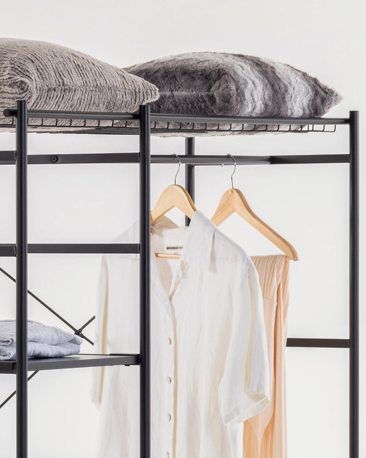 This doorless closet is a steel structure spray painted in black with four racks at different heights and hooks for both your trousers and shirts. The perfect combination and distribution for storing all kinds of clothing and accessories. Design is useful.