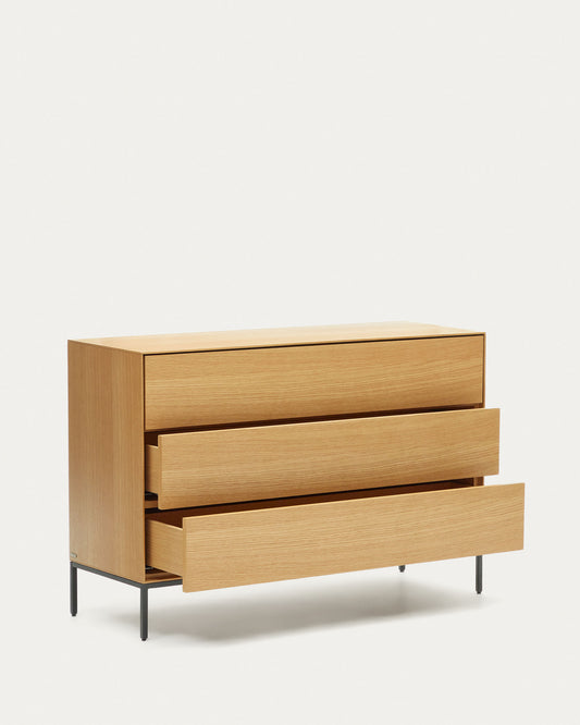 Vedrana 3 drawer chest of drawers in oak veneer with black steel legs, 110 x 75 cm