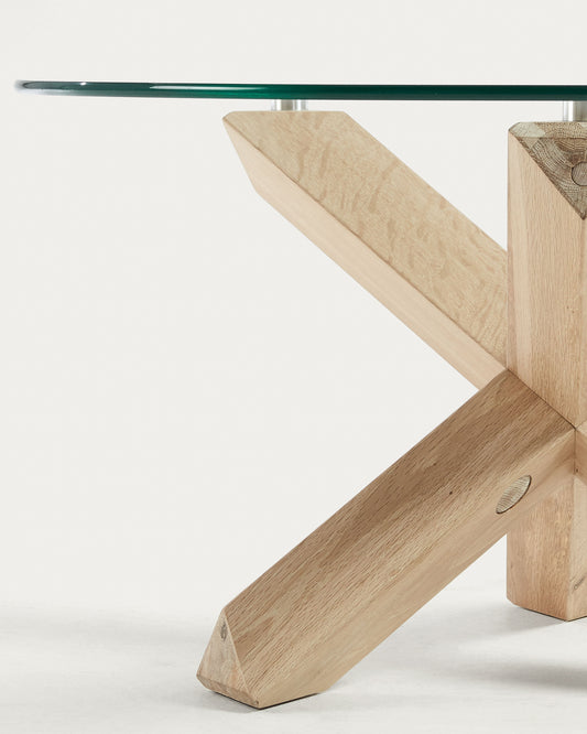Lotus glass top coffee table with solid oak wood legs, Ø 65 cm