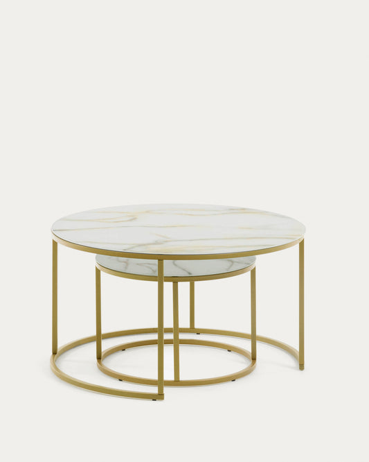 Set of 2 Leonor glass side tables in white and golden steel structure Ø 80 cm / Ø 50 cm