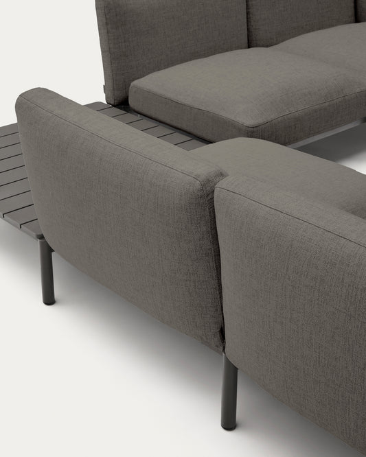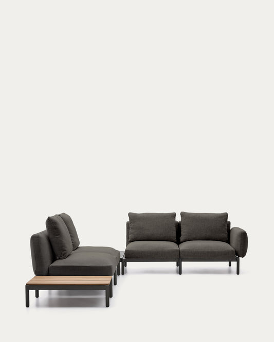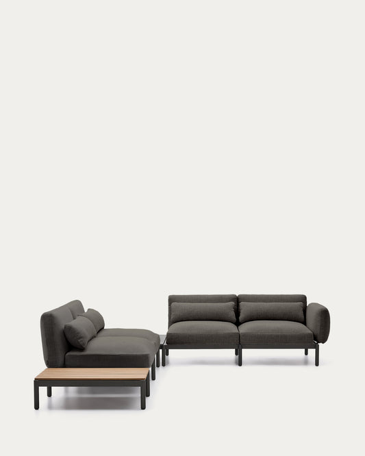 - 4-seater modular outdoor sofa with grey upholstery and grey aluminium structure. With aluminium corner table and teak end table.