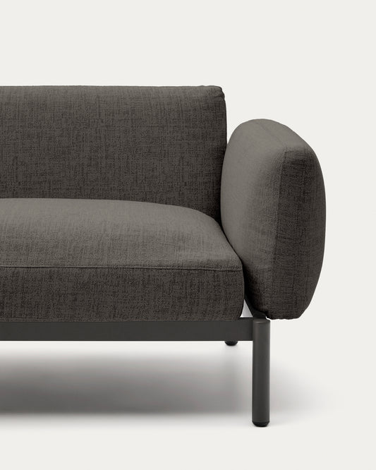 - 5-seater modular outdoor sofa with beige upholstery and grey aluminium structure. With integrated table and teak end table.