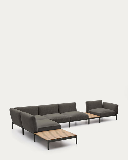 Sorells outdoor modular 5-seater corner sofa with grey upholstery and grey aluminium with teak tables 277 x 446cm FSC 100%