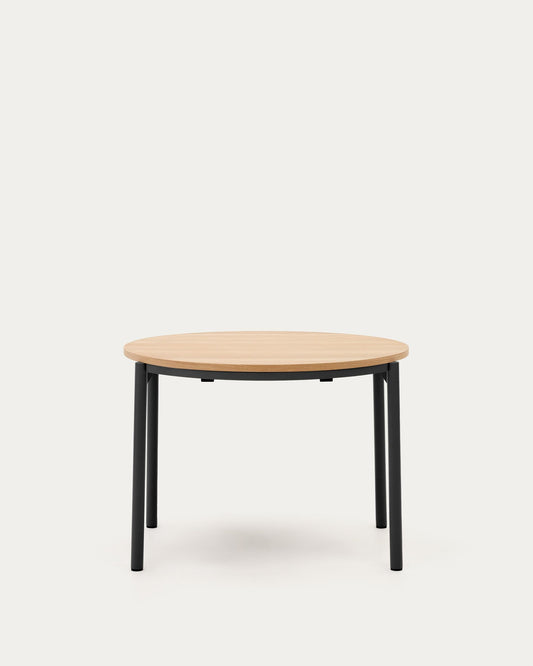 - Round extendable table made of oak veneer and with steel legs in a black finish.