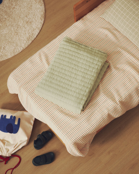 Bedspread made entirely of cotton, specially designed for 90 cm beds. Its embossed stripe-effect pattern adds texture and visual depth. Cotton provides softness and breathability, ideal for year-round comfort. Produced in Portugal, a country renowned for its long tradition and know-how in textile manufacturing, this bedspread combines quality with durability. A versatile and timeless option, perfect for both kids’ bedrooms and guest rooms.
