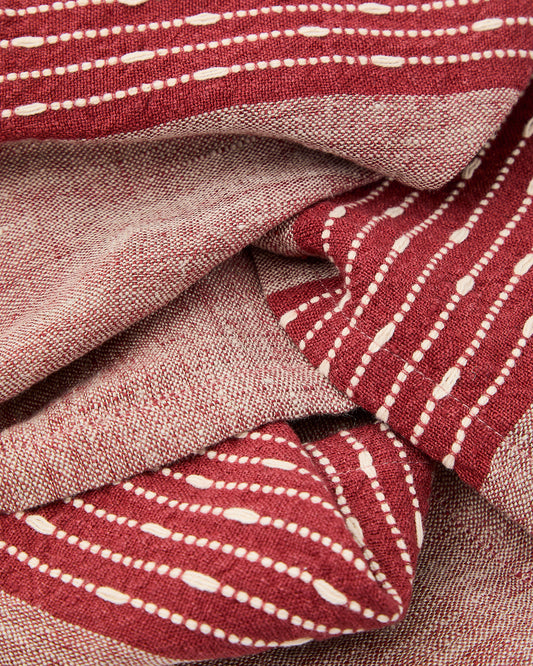 A 100% linen collection that stands out for its timeless elegance and impeccable craftsmanship. The design features a contrasting jacquard and a central stripe that bring visual dynamism and sophistication to the table. Each piece is handwoven, making every placemat unique with slight variations. The linen provides a soft touch and natural drape, always feeling fresh and lightweight. Its strength and durability make it the perfect choice for both everyday use and special occasions.
