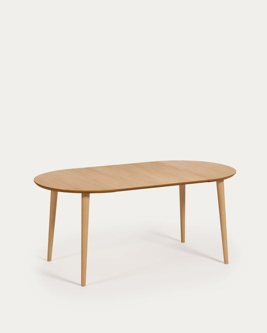 Oqui extendable round table in MDF oak veneer and solid wood legs, 90 (170) x 90 cm