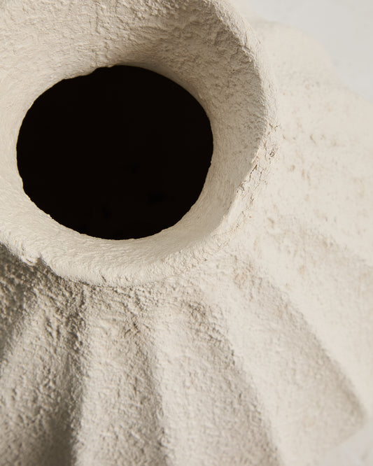 - Beige papier-mâché vase.