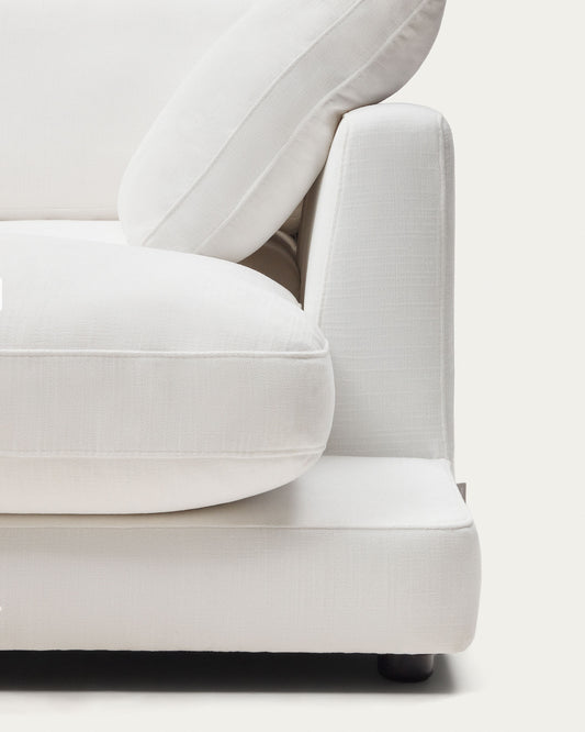 Gala combines design, comfort and quality in a piece that transforms your living room into a relaxed and stylish space. Its rounded shapes and generous dimensions create a cosy atmosphere, perfect for enjoying special moments with family or friends. Its upholstery in high-quality, small-structured chenille fabric, made from polyester and cotton, provides a soft and pleasant texture to the touch, as well as ensuring remarkable resistance and durability. It includes a stain-resistant treatment, which allows it to be cleaned with a damp cloth and water. The removable seat and backrest covers are machine washable. The fabric supplier is OEKO-TEX® STANDARD 100 certified for environmentally safe and responsible production. The seat cushions are filled with down-effect virgin fibres, providing a soft, comfy and enveloping firmness. The filling is made from 100% soft fibre, a siliconised fibre that offers an enveloping feel and comfort very similar to down, along with a 30kg/m³ density foam core, covered in fibre on both sides allowing them to be turned over. They also have internal partitions that ensure uniform distribution of the fibres, ensuring optimum support upon every use. The cushions have removable, reversible covers. The internal structure is made with FSC Mix Credit certified pine wood, made with a mix of materials from FSC-certified forests and FSC-controlled wood. Made in Europe, the Gala sofa reflects quality and care in every detail. This piece offers design, comfort and durability in a perfect option for those seeking quality in every part of their home. Gala stands out not only for its elegant and versatile style but also for its ability to adapt to everyday needs, making it the centre of attention in any room.