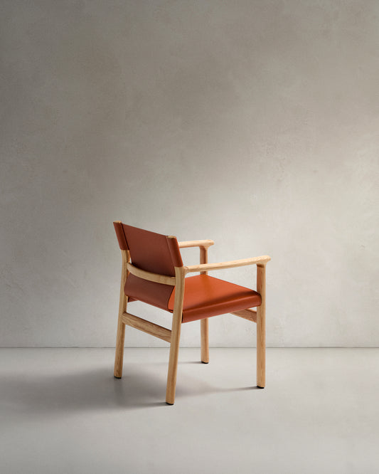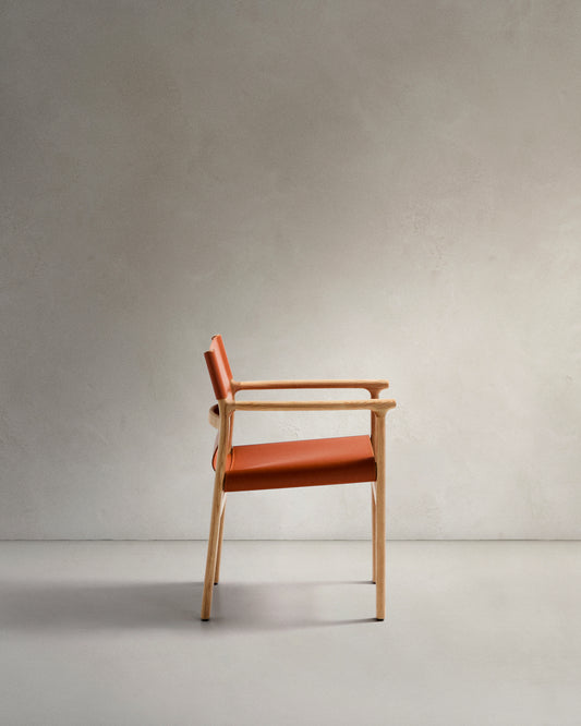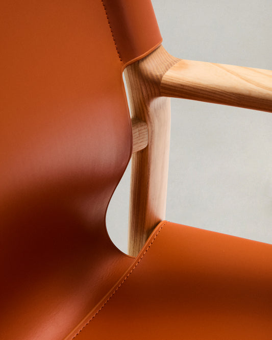Jan chair made of light brown recycled leather fibres and FSC 100% solid ash wood with natural tone finish