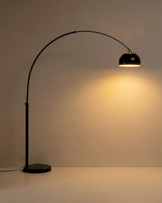 - Steel floor lamp with glossy black painted finish and black marble base.