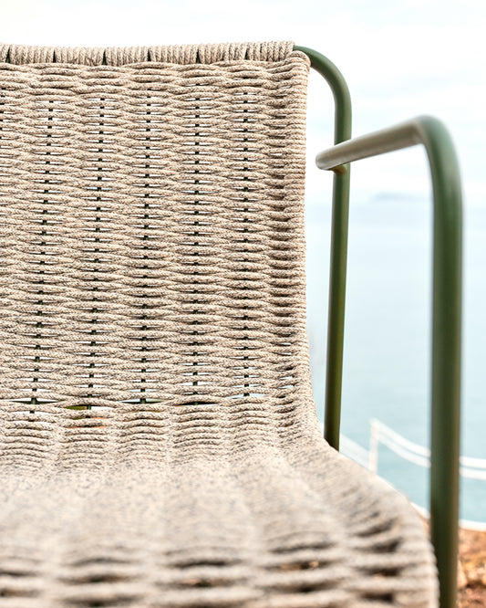 - Hand-woven Seat and backrest made with hand-woven, UV-resistant ecru and grey mottled rope cord.