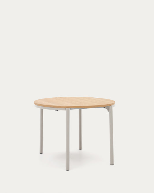 - Round extendable table made of oak veneer and with steel legs in a grey finish.