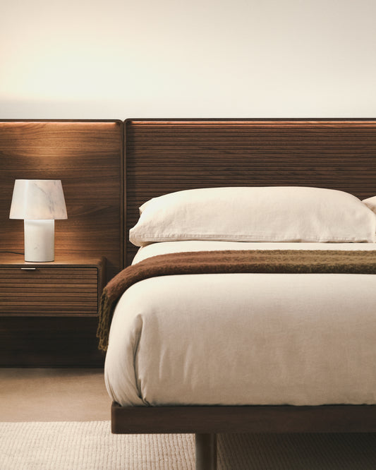 - Bed with headboard and two bedside tables in walnut veneer with horizontal linear milling and LED light strip at the top.