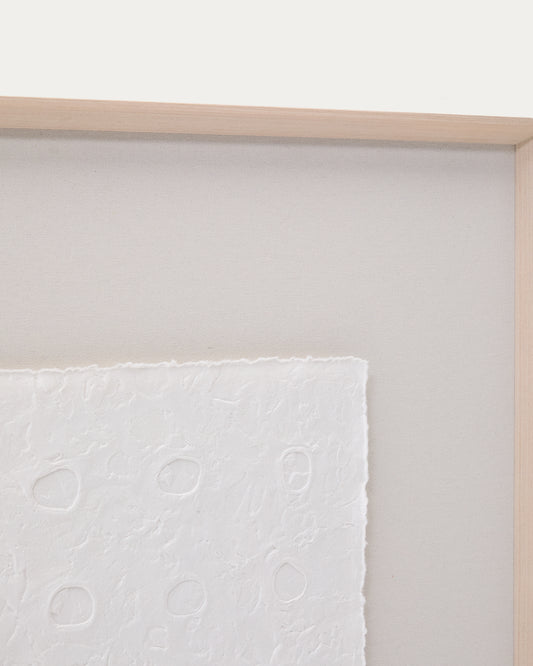 The Olvin picture is crafted from white recycled paper, with unique handmade reliefs that stand out for their authentic character. Each piece is the result of a pressure technique that creates a centred pattern of dots and circles, adding texture and dimension to the design. Its clean finish makes it an ideal choice for adding an artistic and original touch to any space. It also combines perfectly with the other pictures in the collection, allowing you to create harmonious visual compositions full of character. Each relief reflects the dedication to its creation, making this work a decorative accessory that combines sustainability and contemporary design.