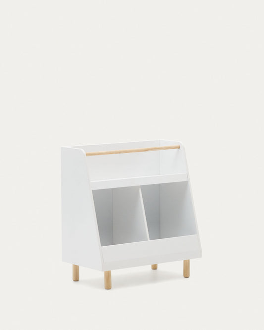- MDF bookcase with white lacquered finish and solid pine wood legs.