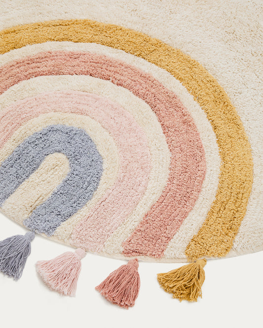 This collection is made of cotton, which gives it exceptional softness and a pleasant texture to the touch. Each piece is hand-woven, making every product unique, with slight variations that enhance its exclusivity and special character. The design features rainbow-shaped reliefs and fringes, a decorative detail that adds color to any children’s space. Designed for everyday life, this collection is machine washable, making it easy to clean and allowing children to always enjoy a comfortable and well-kept environment. A warm and original proposal to create spaces full of personality and charm.