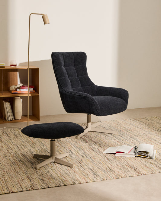 - Cushioned footrest upholstered in tight-knit dark blue chenille fabric and soft to the touch.