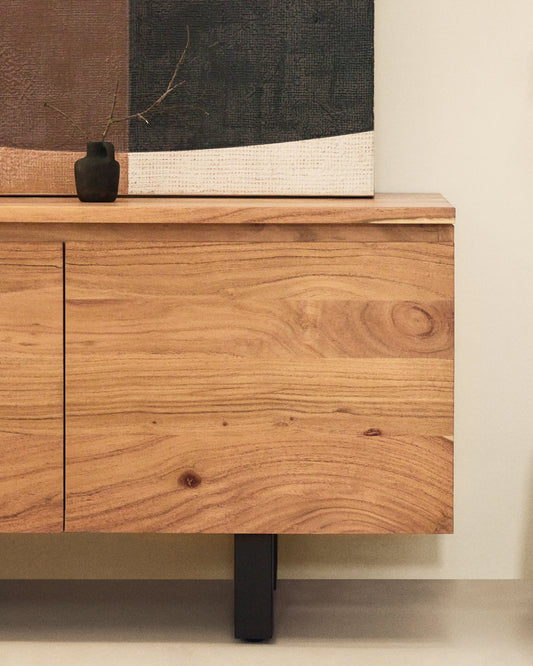 The Uxue collection redefines functionality and style in any space with its clean, contemporary design. The solid acacia wood, with its bleached finish, conveys a unique warmth and enhances the wood’s grain, adding light and sophistication to the room. Each door is perfectly integrated into the piece, creating a harmonious and minimalist look that adapts to any type of decoration, from the most modern to the most classic. The black-finished steel legs provide an elegant and subtle contrast, raising the structure and ensuring stability and durability. The legs are adjustable, making it possible to bridge any unevenness in the floor and ensuring that the TV stands always remains perfectly level. Designed to adapt to your needs, this TV stand has holes in the back that allow you to organise and pass the cables of your electronic devices through, keeping it tidy and maintaining the aesthetics of the space. The soft-close hinges offer comfort and safety every time the doors are opened and closed, protecting both the furniture and its contents. This TV stand is the perfect solution for those who are looking for storage capacity, timeless design and robustness in a single piece, making it the undisputed protagonist of any room.
