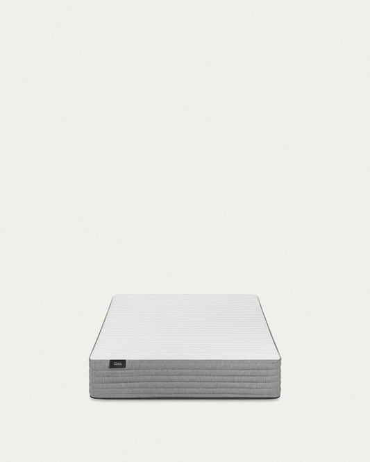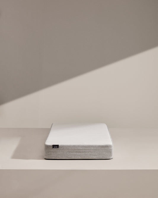 Stretch fabric The stretch fabric is a material designed to adapt to the shape of the body or a surface, thanks to the incorporation of elastic fibres in its composition. This flexible fabric not only provides greater comfort by perfectly adjusting to the curves of the mattress, but also improves durability and resistance. Its ability to stretch and return to its original shape makes it an ideal choice for maintaining freshness and comfort over time, creating a surface that follows every movement during rest. Athermic fibers Composed of athermal fibres, this layer is designed to improve the breathability of the mattress, ensuring constant ventilation and regulating body temperature during rest. These athermal fibres do not retain heat, allowing for a cool and comfortable feeling throughout the night. High-density viscoelastic foam A layer of high-density memory foam that adapts to the shape of your body, providing personalised relief at pressure points. This technology ensures ergonomic support and an enveloping sense of comfort, creating an optimal rest experience. Additionally, its ability to regain its original shape after each use ensures exceptional durability. Firm foam The hard polyurethane foam of this mattress is designed to offer firm and resistant support, ideal for those seeking a more solid sleeping surface. This material ensures excellent durability and stability, maintaining the shape of the mattress and providing correct spinal alignment. In addition to its resistance, the hard polyurethane foam contributes to an even weight-distribution, preventing deformations over time and ensuring a longer mattress lifespan. Firm core foam reinforcement This mattress includes two 3 cm thick foam slabs, one on each side, with a density of 23 kg/m³. These layers provide additional firmness that improves the mattress's support, offering a stable and structured feeling on both sides. Designed to offer durability and resistance, these slabs ensure that the mattress maintains its firmness and shape over time. Pocket spring core This mattress has a 16 cm core of pocket springs, with each spring individually wrapped in a casing, allowing them to move independently. This advanced system improves the adaptability of the mattress to the body's movements and contours, providing precise support in the areas that need it most. With a firmness rating of 2.0, this core offers a medium to high support sensation, ideal for those seeking a balanced combination of comfort and stability without being excessively hard. The 16 cm height ensures a solid and durable base, keeping the mattress in optimal condition for restful sleep. High-density perimeter foam reinforcement This mattress is equipped with an 11 cm thick perimeter reinforcement and high-density foam of 30 kg/m³, designed to increase edge resistance. This extra-firm reinforcement offers greater structural stability, preventing deformations around the mattress edges and guaranteeing a solid surface even at the edges.